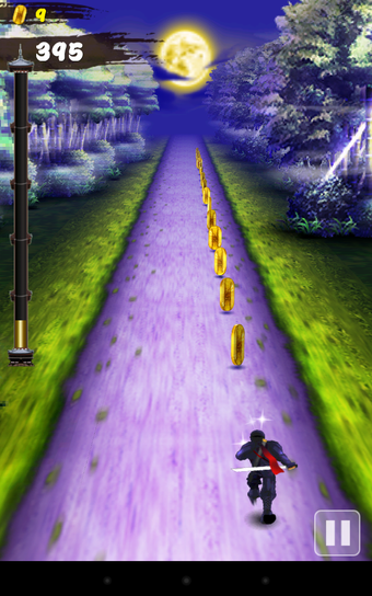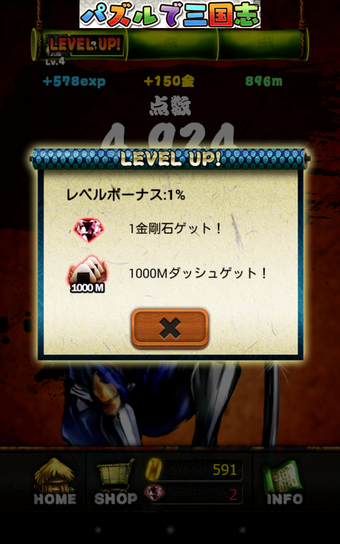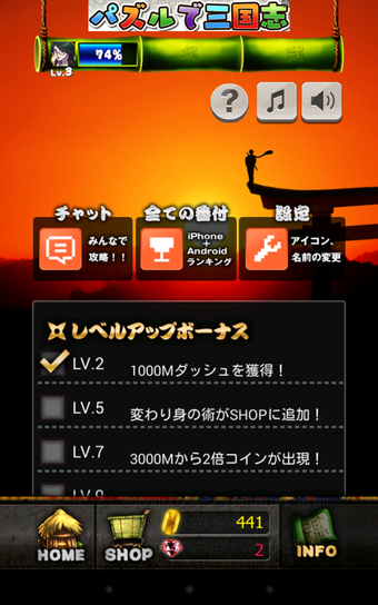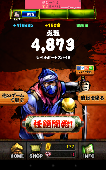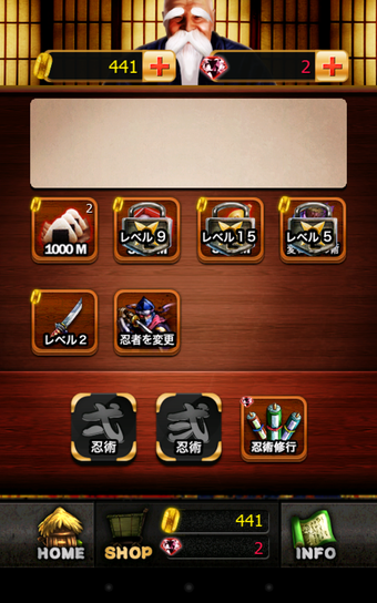ゲームをスタートすると、忍者が手前から奥に向かって猛然とダッシュを始めます。目的はただ一つ、抱えた巻物をより遠くに運ぶこと。行く先には灯篭や馬に乗った武士などが待ち構えていますので、タップで対応しましょう。相手が敵の場合はタップで攻撃、障害物の場合はタップで避けることができます。敵を倒して経験値を集めるとレベルがアップします。レベルが上がるとスコアが上がりやすくなったり、ショップに新しいアイテムが並んだりします。